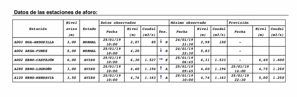 Como consecuencia de la crecidas que se han observado en la cuenca alta del Ebro y las cuencas del Ega-Arga durante las tres últimas jornadas, el Ebro está experimentando una crecida extraordinaria en el tramo desde Haro hasta Alfaro, donde se espera que alcance caudales máximos entre 1200 y 1300 m³/s en las estaciones de aforo de Logroño (que equivalen a 4,60-4,85m) y en la de Mendavia (que equivalen a 4,80-5,20m) durante toda la jornada de hoy viernes hasta incluso primeras horas del sábado antes de la confluencia con el río Aragón.