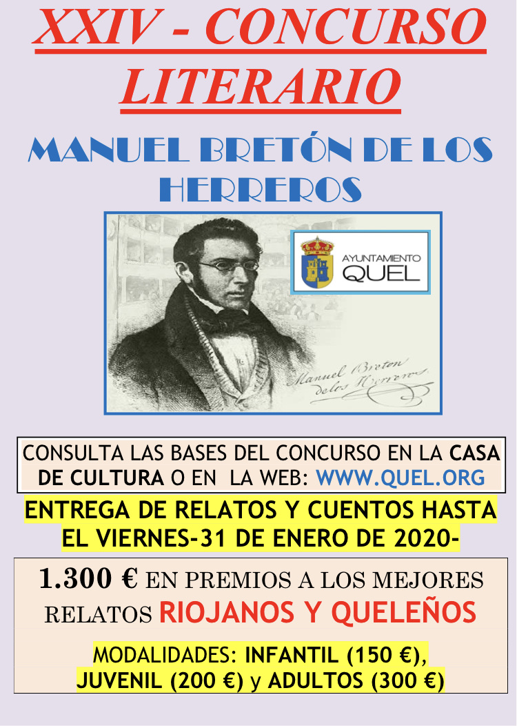 El Ayuntamiento de Quel ha convocado la 24 edición del concurso literario D. MANUEL BRETON DE LOS HERREROS (el dramaturgo queleño más reconocido de la historia por sus obras teatrales y su poesía).