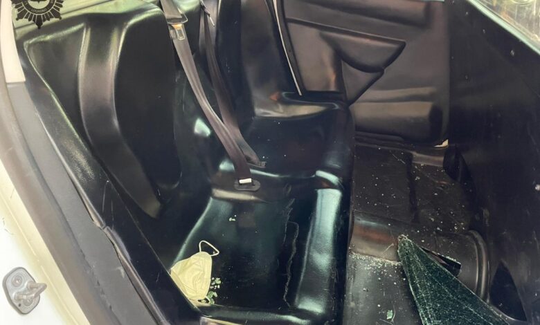 Al tratar de ser introducido en el vehículo policial causó varios daños en el vehículo patrulla, por lo que se tuvo que utilizar un segundo coche, al que también causó daños, tanto en la puerta como en la ventanilla.