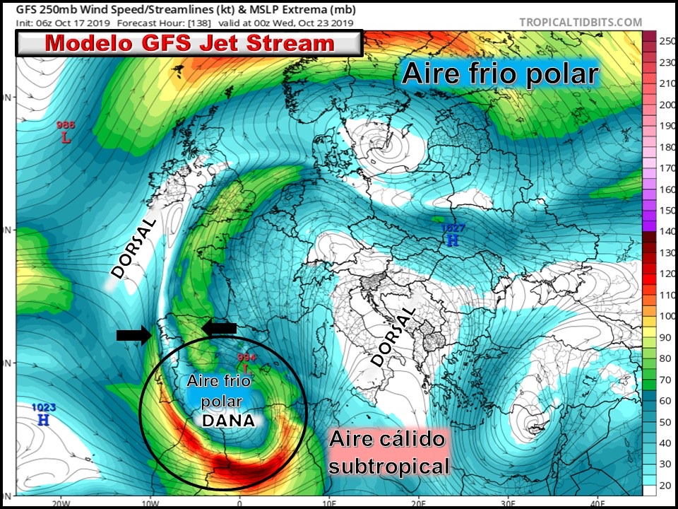 6.- Descripción de la situación meteorológica: Durante la noche del lunes al martes, una DANA (Depresión Aislada en Niveles Altos) se situará sobre el suroeste de la Península desplazándose posteriormente hacia el área mediterránea. Esta configuración en niveles medios y altos de la atmósfera irá acompañada, en niveles bajos, de un proceso de ciclogénesis (desarrollo de bajas presiones en superficie) que se iniciará en el norte de Argelia, extendiéndose las bajas presiones entre el martes y el miércoles por el Mediterráneo occidental hacia el nordeste peninsular.