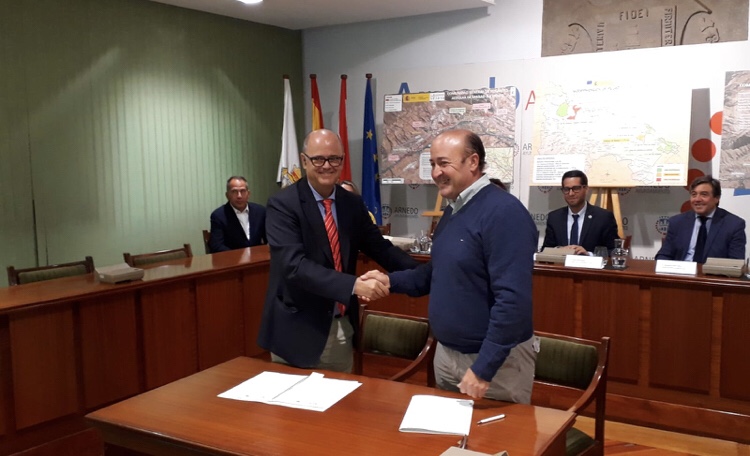El presidente de la Sociedad Mercantil Estatal de Infraestructuras Agrarias, Alejandro Alonso, y el presidente de la Comunidad General de Regantes de la Acequia de Mabad, Ángel Fernando Ezquerro, han firmado hoy en el Ayuntamiento de Arnedo, la adenda al Convenio regulador para la financiación, construcción y explotación de las obras de modernización de los regadíos de esta Comunidad General.