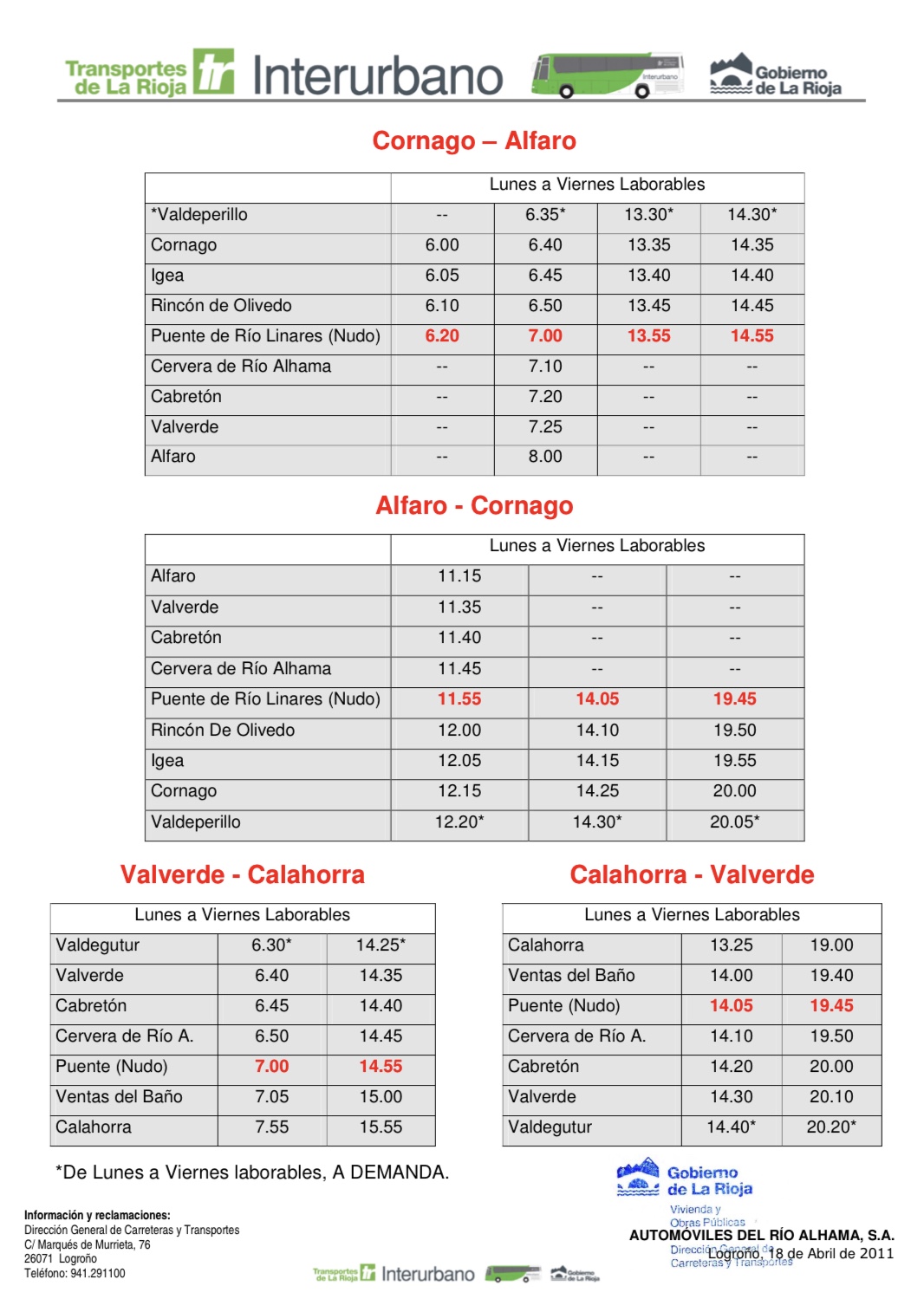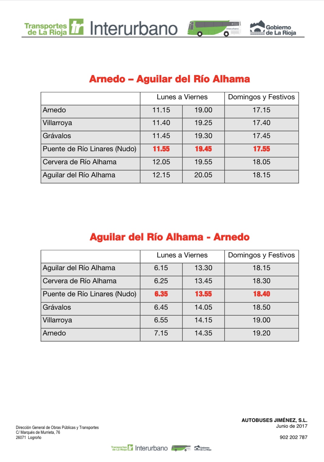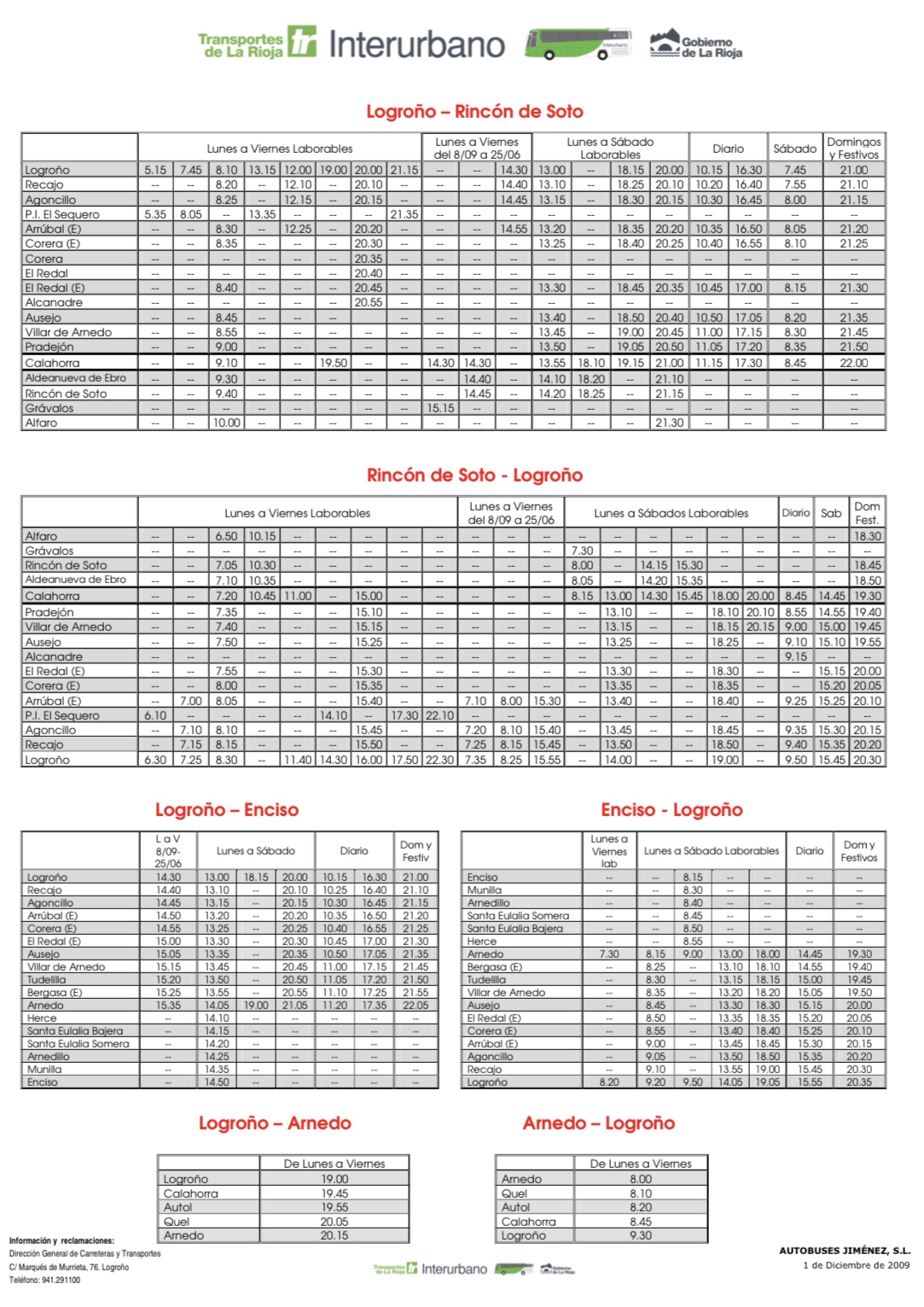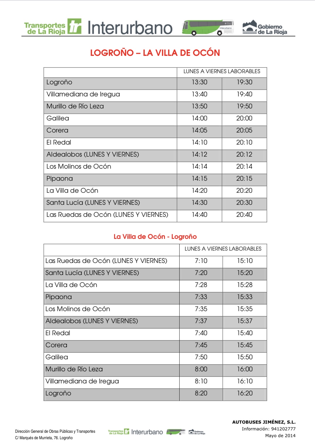 Los horarios habituales del transporte de viajeros puede consultarse en la web del Gobierno de La Rioja. Además, los usuarios podrán solicitar información de todos los servicios disponibles llamando al teléfono de la compañía de transporte.