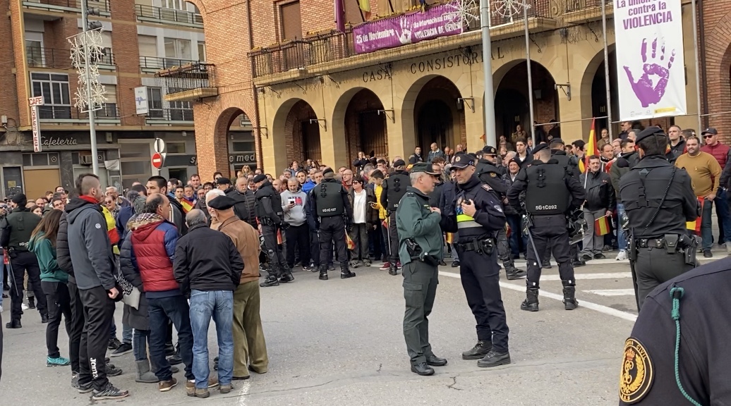 Pero la tensión aún creció más cuando se llegó a la glorieta de Quintiliano, lugar donde debía concluir la manifestación. Al importante despliegue de los cuerpos de seguridad para garantizar el derecho a la manifestación, se sumaban antidisturbios llegados de Zaragoza. La manifestación llegó acompañada por un reguero de banderas de España y aún más banderas esperaban en el lugar.