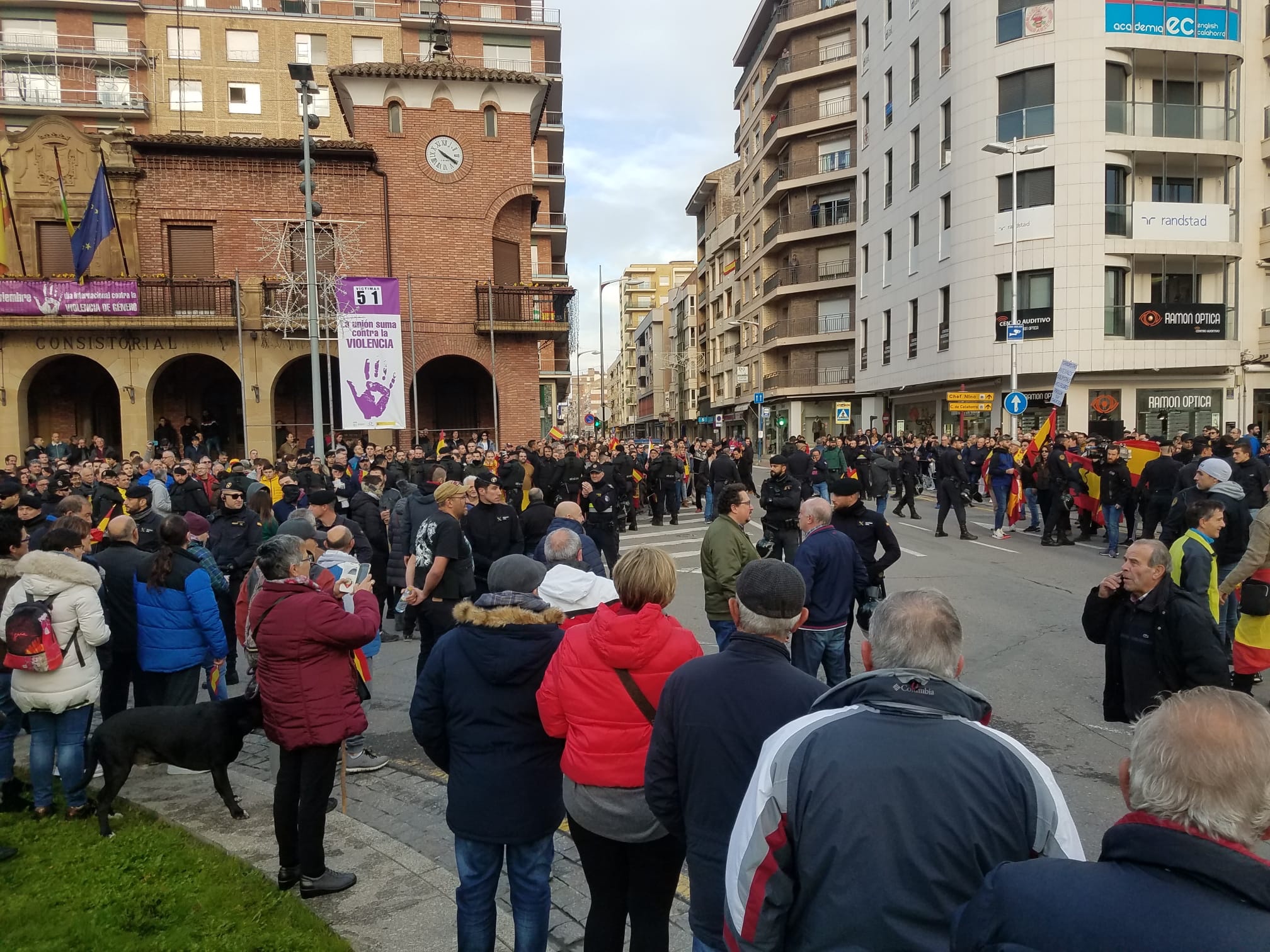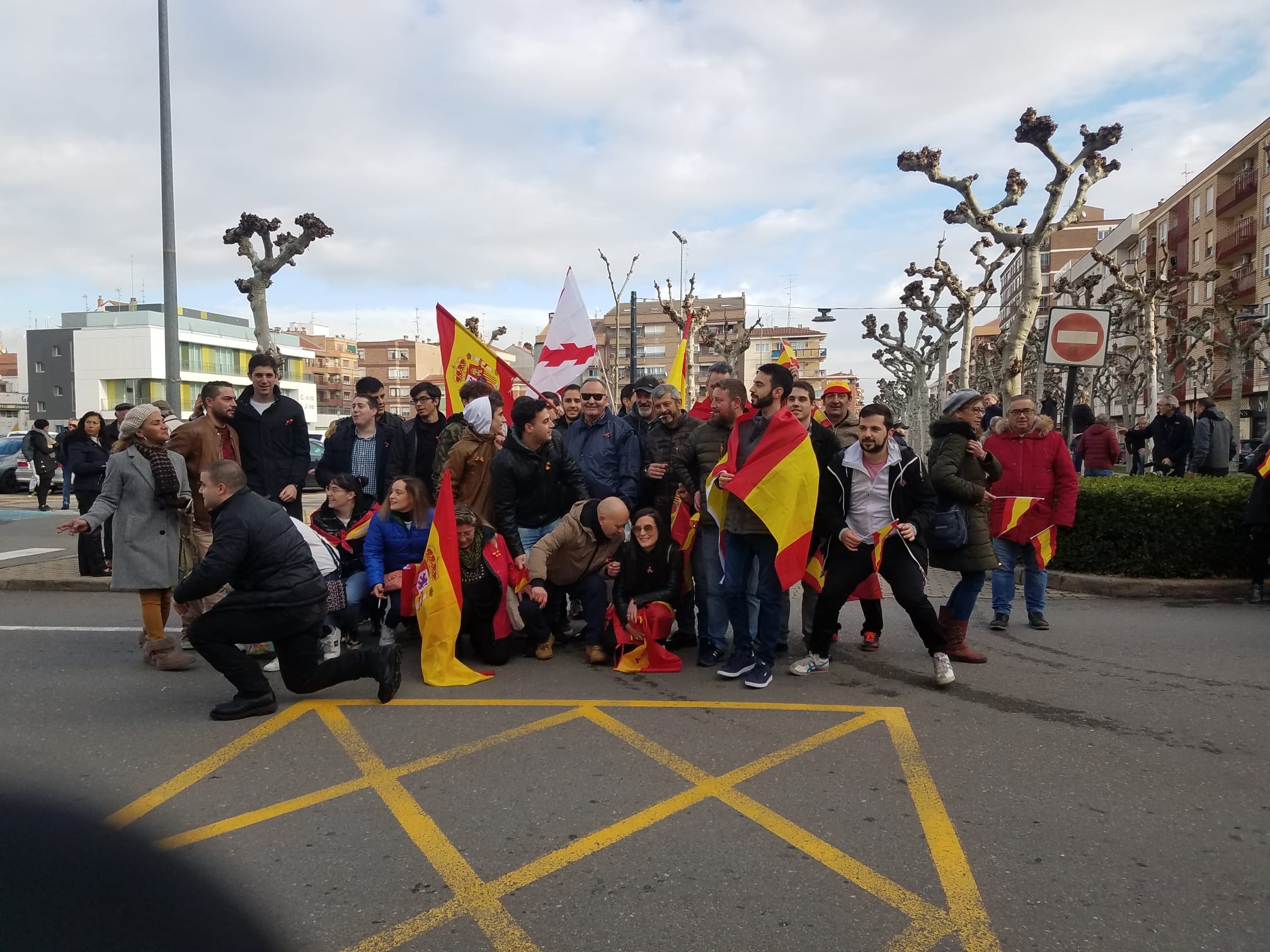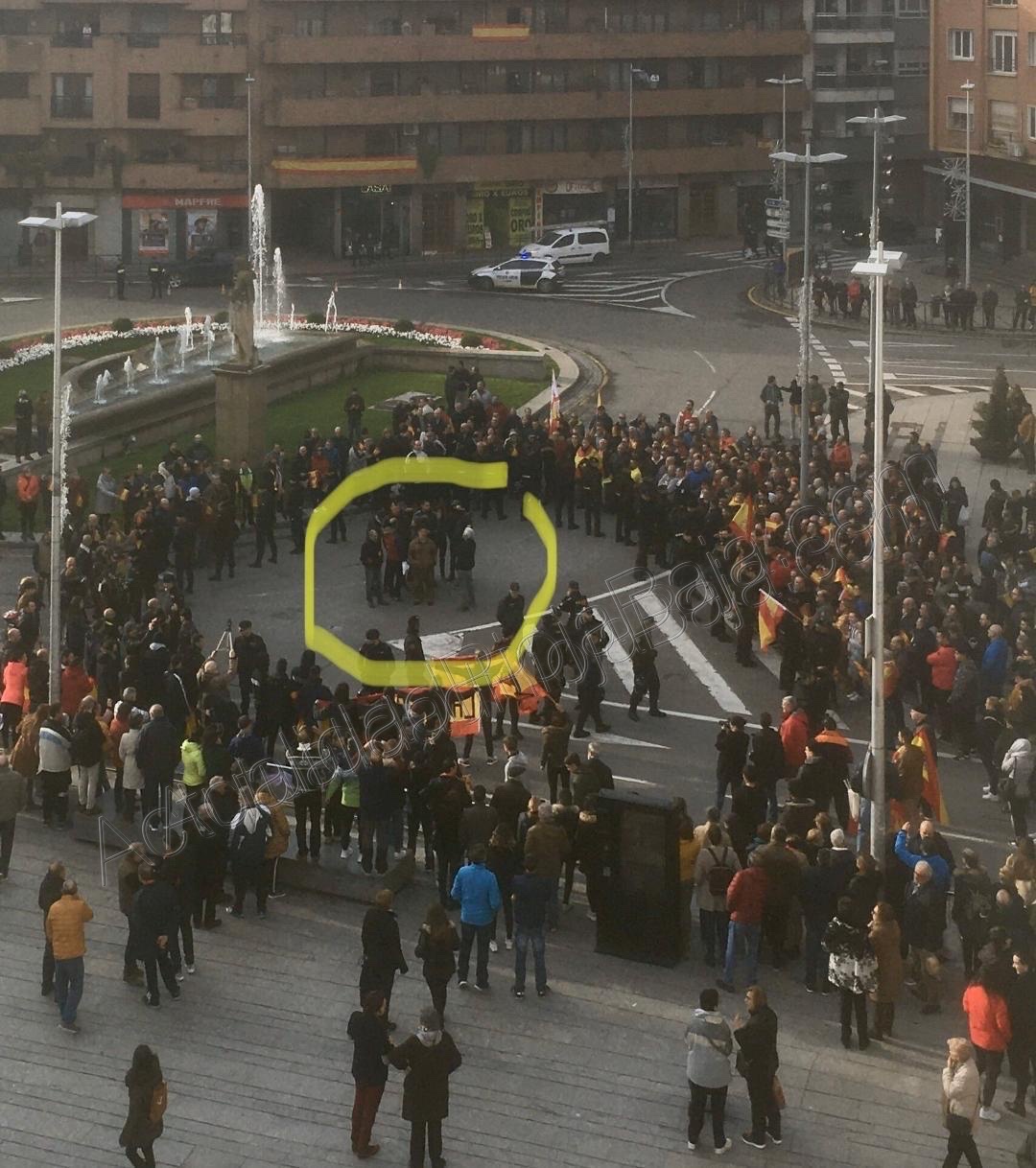 Pero la tensión aún creció más cuando se llegó a la glorieta de Quintiliano, lugar donde debía concluir la manifestación. Al importante despliegue de los cuerpos de seguridad para garantizar el derecho a la manifestación, se sumaban antidisturbios llegados de Zaragoza. La manifestación llegó acompañada por un reguero de banderas de España y aún más banderas esperaban en el lugar.