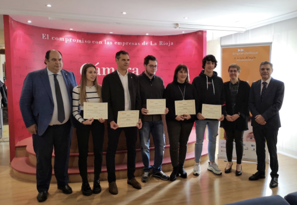 El Concurso de Ideas de Negocio de FP, organizado por la Cámara de Comercio, Industria y Servicios de La Rioja junto al Gobierno de La Rioja en el seno del Plan EmprendeRioja, ha reconocido esta mañana las propuestas ‘Vendimprenta’, de Nuria Ruiz (IES La Laboral); ‘Fisioterapia para peregrinos’, de Alex Merino (C.P.C. Sagrado Corazón-Jesuitas); y ‘Renting de portátiles, tablets y smartphones para estudiantes’, de Egoitz Penedo (C.P.C. Sagrado Corazón-Jesuitas). A la entrega han asistido el director general de la Cámara de Comercio, Florencio Nicolás; la subdirectora de Formación Profesional, Carmen Méndez; y el gerente de ADER, Fernando San José.